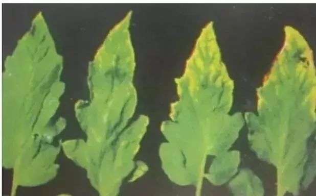 1、一般作物,下部叶片尖端变黄,延叶片边缘逐渐枯黄,叶脉两端和叶中脉仍为绿色,严重时,大部分叶片枯黄,叶边缘呈火烧状;