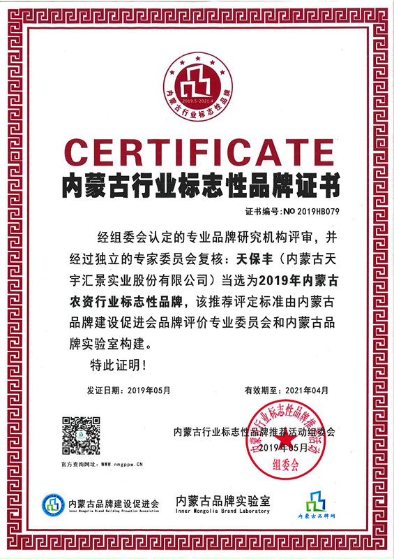 “内蒙古味道品牌发展论坛暨内蒙古行业标志性品牌”推荐会上,我天宇汇景集团旗下“天保丰”品牌被评选为2019年内蒙古农资行业标志性品牌。