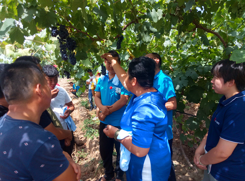 第二站来到宁夏回族自治区的永宁县,拥有全国最全的作物类型地区之一,首先来到种植户秦先生的葡萄大棚。秦先生之前一直从事农资行业,在农化方面积累了一定的专业知识,因此对我们此次到访并不欢迎。但当孙老师顶着炎炎的烈日,在地头详细的讲解各种葡萄种植技术以及常见的病虫害防治知识时,秦先生的目光变了,开始主动和孙老师请教,主动和我们交流在葡萄种植过程中发生的问题,主动和我们互相加了微信、留存了电话,还摘了他园子里最大最甜的葡萄给我们吃。因为具有专业的农化知识水平获得客户的认可让我们心里如同吃到嘴里的葡萄一般特别的甜。