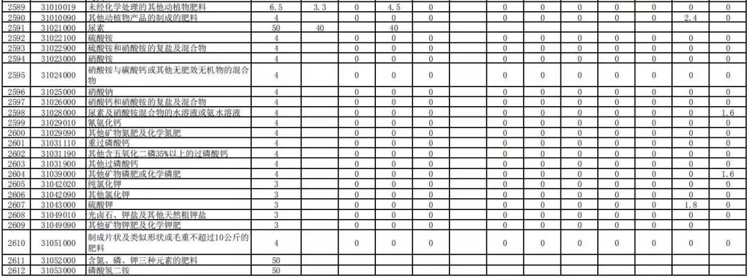 在进口关税方面,硫酸钾、磷肥、含氮磷两种肥效的化肥肥料、其他肥料等,2020年暂定关税均为1%。