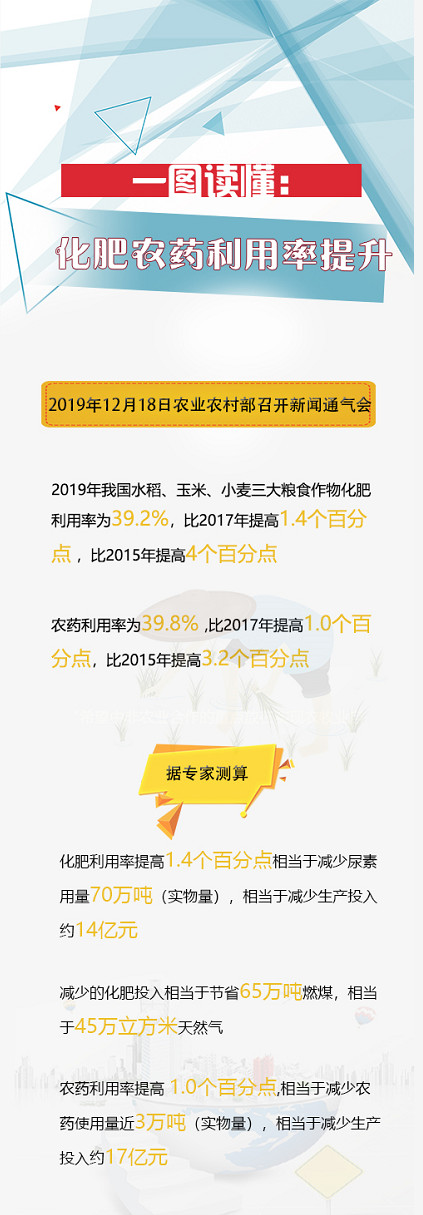 刚刚,记者从12月18日农业农村部的新闻通气会得知,2019年我国水稻、玉米、小麦三大粮食作物化肥利用率为39.2%,比2017年提高1.4个百分点、比2015年提高4个百分点;农药利用率为39.8%,比2017年提高1.0个百分点、比2015年提高3.2个百分点。