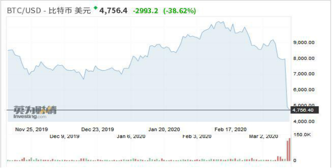 比特币连续多晚遭遇血洗,3月13日早晨,价格再次跳水,半小时狂泻近2000美元,近24小时跌幅超40%。