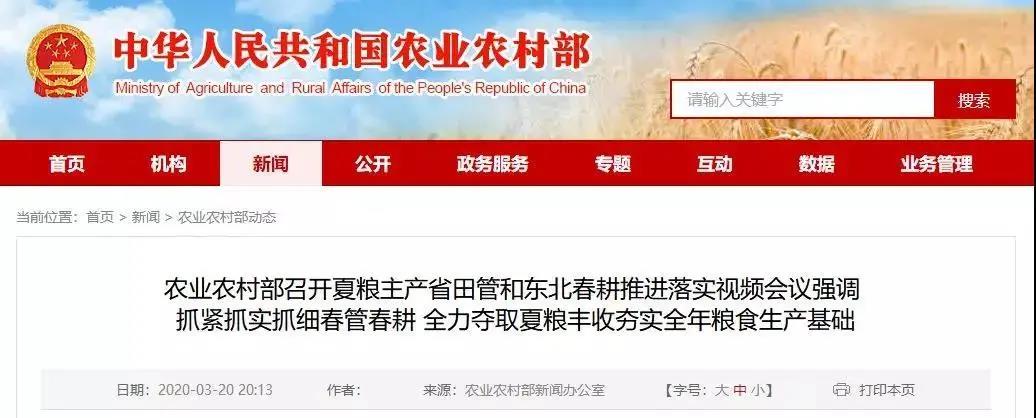 3月20日,农业农村部召开夏粮主产省田管和东北春耕推进落实视频会,分析当前春季农业生产形势,进一步部署安排夏粮田管和春耕工作。