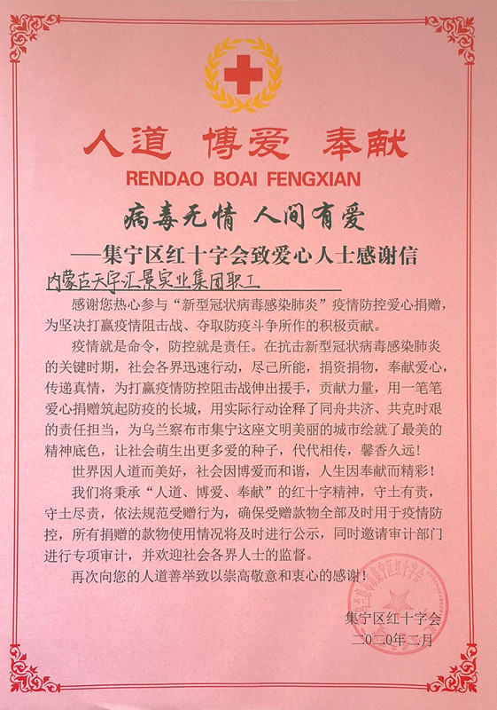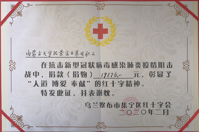 4月3日,乌兰察布市集宁区红十字会就我集团前期在疫情期间全体员工捐款事宜向我天宇汇景集团全体员工颁发“抗击新冠肺炎疫情防控捐款”荣誉证书及感谢信。