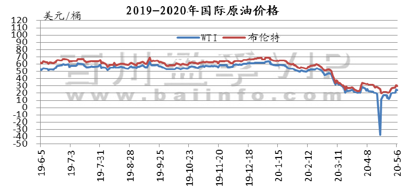 本周周内减产协议执行及疫情管控放松,国际油价大幅上涨。原油期货整体上涨。其中WTI期货本周均价21.51美元/桶,较上周上涨46.04%,较上月上涨28.24%;本周布伦特期货均价27.92美元/桶,较上周上涨32.00%,较上月上涨4.84%。