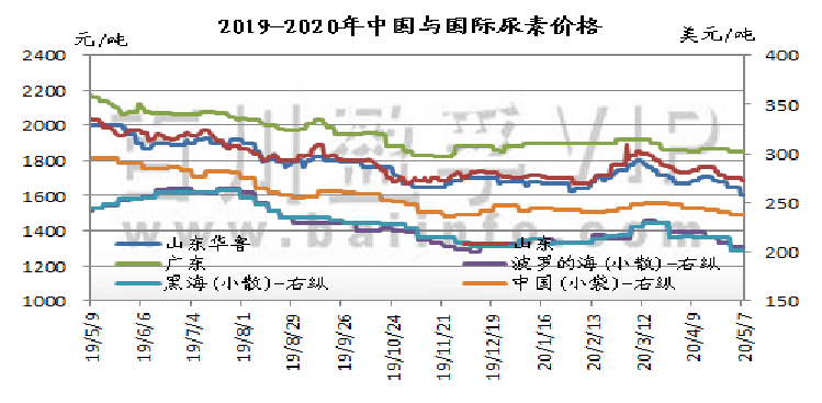 本周国内尿素市场延续五一节假日前的跌势,价格续降,本周主产区主流价格累计跌幅10-50元/吨。截止今日,山东及两河出厂报价在1610-1680元/吨,成交1610-1640元/吨,整体价格重心呈下行走势。节假日期间,市场成交清淡,厂家主要执行预收订单,价格淡稳。节后,高速公路恢复收费,运输成本有所增加;目前农需依然清淡,多地仅零星采购,且商谈空间加大;南疆及东北地区需求不佳,部分企业存库存压力,华东、华北胶板厂开工率回落,需求看弱,而供应量仍保持在16万吨左右,仍处于供过于求状态。就目前整体形势来看,后期国内尿素市场需求仍处低迷态势。