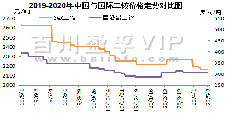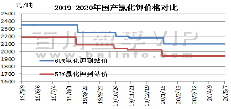 本周氯化钾市场弱势观望运行,2020年4月30日,2020年钾肥进口合同达成,价格为CFR 220美元/吨,较2018年下降70美元/吨。目前港口可售现货较少,但保税区货源充足,近期将开始陆续过货,市场看空心态较浓,同时市场淡季,需求支撑不足,目前实际成交较少,观望气氛持续,近期价格或仍有走低可能。