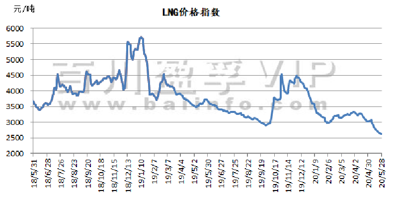 本月,价格指数从4月29日的3020元/吨,下跌至当前2626元/吨,跌幅394元/吨,本月国内液化天然气价格涨后连续下跌,LNG码头为抢占市场挂牌价格也随之降价。截止目前价格有一定幅度浮动,调价幅度已对下游造成一定影响。随后LNG需求量明显下降,LNG上游受到影响引起大面积降价,市场跌势迅速扩大。