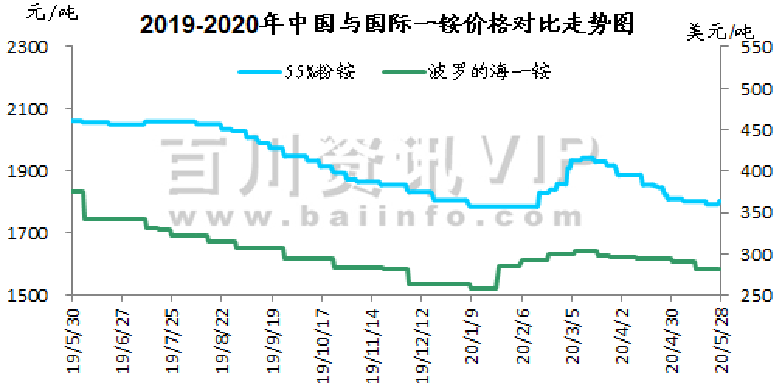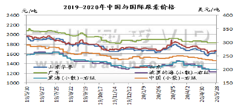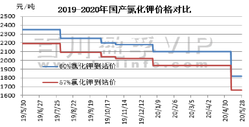 5月氯化钾市场看空气氛较浓,4月30日,2020年中国钾肥进口合同达成,价格为CFR 220美元/吨,较2018年下降70美元/吨。市场整体库存较为充足,保税区陆续过货。大合同签订后,国产及进口钾价格均有所下滑,盐湖集团基准产品到站价格下调280元/吨,保底政策依然执行。当地时间2020年5月12日,印度也与加拿大钾肥公司Canpotex达成2020年钾肥进口合同,价格为CFR230美元/吨,较中国进口合同价格高10美元/吨。
