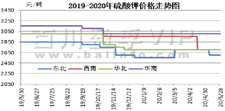 5月硫酸钾市场若稳运行为主,原料成本支撑持续走低,下游开工将有所下降,需求支撑偏弱,价格稳中有松动趋势。罗钾进入检修期,预计九月复产,市场开工下滑。截止2020年5月20日,国投罗钾公司9月底复产前现货已全部售罄,不再接现货订单。市场供应量有所减少。曼海姆硫酸钾50%粉主流出厂价2500-2800元/吨左右,52%粉出厂价2600-2900元/吨左右,优惠幅度在50-100元/吨;东北地区50%粉主流出厂报价2600元/吨,圆颗粒报价3100元/吨左右;华南地区价格相对较高,50%粉主流出厂报价3000元/吨。青海水盐体系粉状硫酸钾主流到站报价2250元/吨左右,成交有限,实际成交可谈。