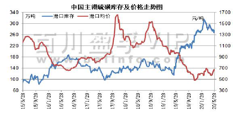 5月,月初“五一”假期归来,国内部分硫磺炼厂库存压力较高,国产硫磺价格承压下行。普光气田方面签单情况尚可,且受港口硫磺市场回暖支撑,普光气田万州港和达州硫磺价格维稳运行。广西石化检修结束,厂内装置陆续开工运行,所处区域内供应情况变化不大。华北地区天津石化于5月5日开始全厂检修,预计时长2个月,库存处于低位。东北地区大连石化于5月8日左右开始全厂检修,库存低位,预计6月下旬检修结束,7月份开工运行并出货。本月中旬,虽然港口市场持货商挺价气氛持续推动,但普光气田万州港固硫价格仅上调20元/吨。国内硫磺市场行情小幅盘整,国产硫磺价格波动有限。下旬,国内港口现货市场价格继续坚挺,硫磺市场行情上行。国内各地区中石化炼厂调价稳中小涨,其中普光气田万州港固硫价格连续小幅调涨至660元/吨,达州固、液硫价格560元/吨,消息面对市场具有一定支撑。因港口现货持货商捂盘挺价,部分下游工厂采购意向转为国产货源,需求面表现尚可,国产硫磺价格小幅上行。