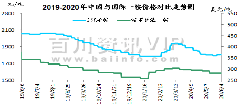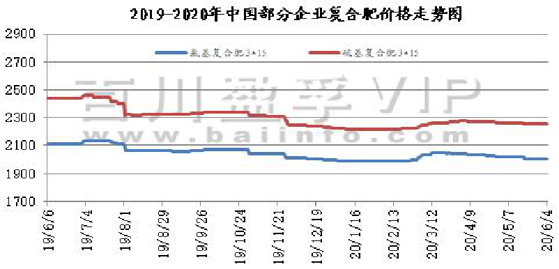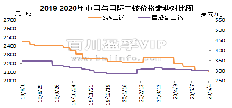 本周(2020.5.29-2020.6.4)二铵市场价格弱势运行,市场交投较低,国内进入需求淡季。云贵地区64%主流成交价格维持在2050-2100元/吨,湖北主流成交价格2100-2150元/吨。国内需求基本停滞,企业集中精力供应出口市场,企业签单量陆续增加。国内主流市场已结束,企业重心出口发运,集港为主,前期出口订单待发量支撑尚可。国际方面,随着市场需求继续保持强劲,南亚成为摩洛哥OCP等生产商的热门出口市场。OCP上周售出了4批磷酸二铵到巴基斯坦,并与其达成了进一步的购销协议。巴西的二铵市场需求开始显现。中国向印度出口了5万吨的DAP。DAP价格小幅上升,生产商报价范围在308-310美元/吨 FOB。印度二铵CFR价格稳定在315美元/吨。