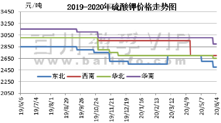 本周(2020.5.28-2020.6.4)硫酸钾市场成本支撑下滑,价格稳中有小幅下调,罗钾现货售罄后,市场供应量有所减少,成交有所好转。国际市场行情暂无明显波动,稳定运行为主。曼海姆硫酸钾50%粉主流出厂价2400-2700元/吨左右,52%粉出厂价2500-2800元/吨左右,优惠幅度在50-100元/吨;东北地区50%粉主流出厂报价2500元/吨;华南地区价格相对较高,50%粉主流出厂报价2900元/吨。青海水盐体系粉状硫酸钾主流到站报价2250-2300元/吨左右,成交有限,实际成交可谈。国投罗钾硫酸钾装置检修,预计九月复产,暂不接现货订单。