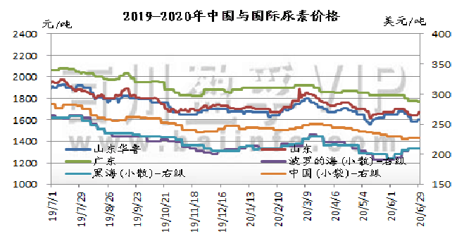 本月国内尿素价格走势呈倒“v”型,上半月上涨,下半月开跌,月末价格较月初价格有20-50元下行。从5月下半月开始,国内尿素检修厂家增多,供应量急剧下行,为尿素价格续涨提供有利条件。其二上半月内需良好,东北及华东局部地区农需追肥备肥持续进行中,接单火爆;新疆地区农需增加,下游接货积极,成交尚可,主产区的库存压力均有所缓解。但郑州局通知,自2020年6月5号18点以后,铁路大票从之前运费优惠的30%,调整为优惠10%,导致山西及河南各厂火运成本有所增加,火运接单积极性减弱。下半月,随着夏季肥需求基本接近收尾,复合肥生产进入淡季,工业需求下滑明显,且市场供应量回升,价格开始走低,且跌速大于上半月涨速。端午节前印标价格明朗,由于内外价差较大,中国出口热情不高,但业内多认为价格下行空间已不大,因此节后贸易商拿货量增加,给月底行情带来复苏迹象。