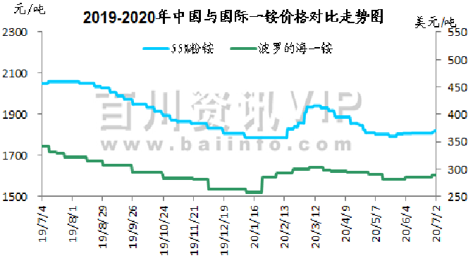 本周(2020.6.29-2020.7.2)二铵市场价格弱势持稳运行,国内市场淡季,需求较少,企业主要重心港口,心态一般。云贵地区64%主流成交价格维持在2050-2100元/吨,湖北主流成交价格2100-2150元/吨。目前国内主流64%成交价格暂稳至2050-2150元/吨。国际方面需求旺盛,由于南亚和东南亚地区需求上涨,中国DAP价格从305-308美元/吨FOB上调至306-309美元/吨FOB。