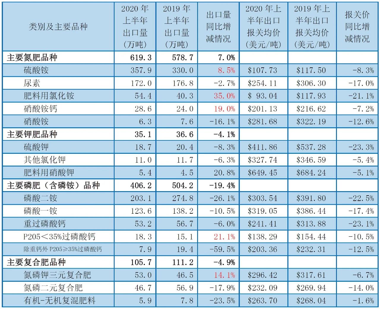 据中国海关统计,2020年1—6月中国共出口各种肥料1193.5万吨(含HS第28章氯化铵、硝酸钾和HS第31章所有肥料),同比减少了5.3%。硫酸铵是累计出口量最多的肥料品种,1-6月累计出口硫酸铵357.91万吨。