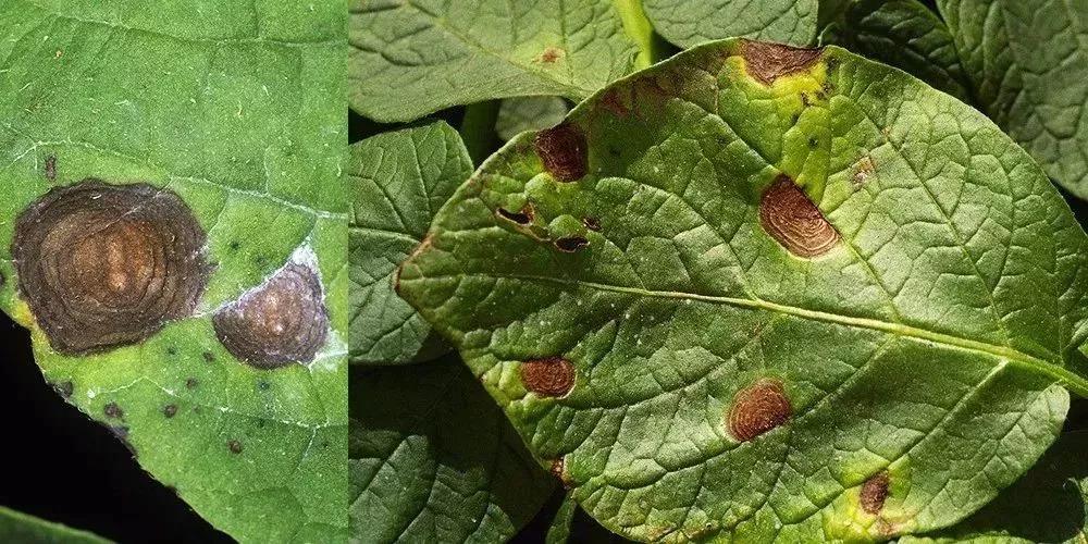 病斑纹理:早疫病有明显的同心轮纹VS晚疫病无同心轮纹。