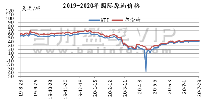 本周周内疫情的再次扩散与美国原油库存大降博弈,国际油价涨跌不一,国际原油震荡上涨。其中WTI期货本周均价41.25美元/桶,较上周上涨0.13%,较上月上涨7.49%;本周布伦特期货均价43.41美元/桶,较上周下跌0.63%,较上月上涨6.32%。