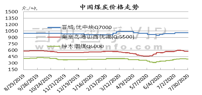 本周煤炭市场价格延续稳中偏弱的走势,部分区域销售不畅,价格有小幅的下跌。下游用户除部分刚需客户采购外,其余基本保持观望的状态。截止7月30日,全国动力煤BTCI价格指数474元/吨,周环比下跌4元/吨;全国炼焦煤BCCI价格指数1045元/吨,周环比持平;全国无烟煤BACI价格指数854元/吨,周环比持平;全国喷吹煤BPCI价格指数793元/吨,周环比持平。
