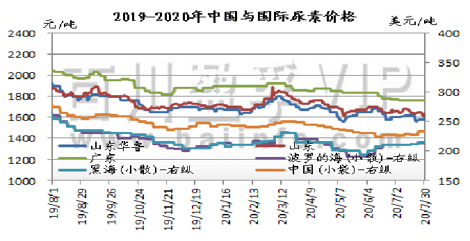 本周国内尿素市场涨跌互现。截止目前,山东及两河出厂报价在1570-1600元/吨,成交1540-1590元/吨。周初,国内尿素市场价格基本持稳,交投温和。周中,印度MMTC对7月30日印标增加附则,中国货源参与投标难度增加,市场信心受挫,期货市场下跌,现货市场随之稳中伴降,不久后印标再发声明,表示接受中国货源,自印度招标“剧情”反转后,国内尿素市场交投氛围回暖,大颗粒价格较为持稳,中小颗粒观望中交投量有限,下游贸易商纷纷积极备货,成交向好,山西及山东等部分工厂接出口订单,个别厂家订单较多且预计出口订单发货可至8月中下旬。