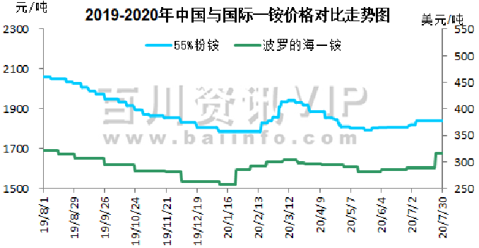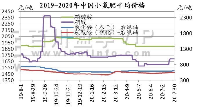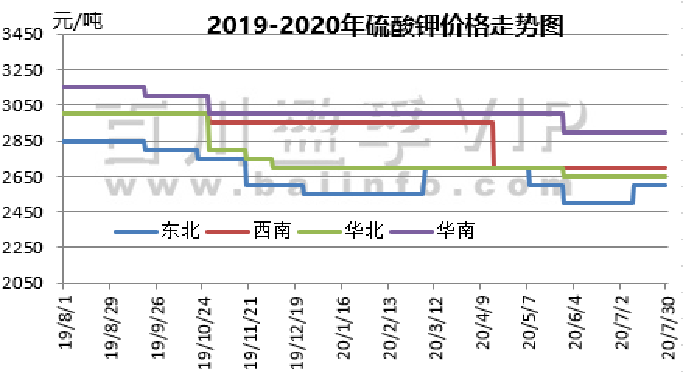 本周(2020.7.23-2020.7.30)硫酸钾市场挺价企稳,市场交投稳定,厂家基本无库存压力。国际市场价格暂无明显波动。曼海姆硫酸钾50%粉主流出厂价2400-2700元/吨左右,52%粉出厂价2500-2800元/吨左右,优惠幅度在50-100元/吨。东北地区50%粉主流出厂报价2500元/吨;华南地区价格相对较高,50%粉主流出厂报价2900元/吨。青海水盐体系硫酸钾主流到站报价2300-2350元/吨左右,成交有限,实际成交可谈。罗钾供应较为紧俏,现货售罄后,后期市场供应量将有所减少。