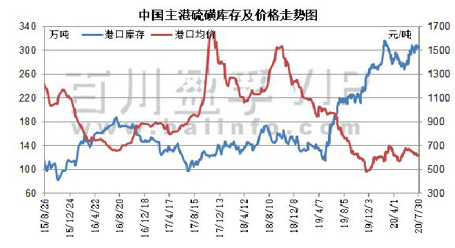 本周(2020.7.24-2020.7.30)国产硫磺价格局部调涨,其中山东地区涨势明显,近期山东港口液硫库存较低,加之部分炼厂产量不高,贸易资源渐显紧张,为此厂家借机抬价,区内挺价氛围浓厚。华北地区因部分货源流入山东市场,价格方面同样受到拉涨,各炼厂报价均上调20元/吨。西南地区普光气田达州固、液硫价格持稳,万州港固硫船运价虽调涨10元至670元/吨,但对市场提振有限。据了解目前万州港固硫库存仍在1万吨附近,可提货源不多对其价格仍有一定支撑。国内其他地区国产硫磺价格大致持稳,供销运行亦较平稳。月底国产硫磺市场大致走稳。