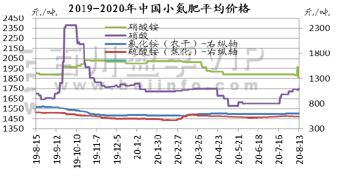 本周(2020.8.7-2020.8.13)一铵行情整理运行,多数企业待发充足,华中地区多数厂家可维持一个月左右待发量,暂无库存、销售压力,东北地区采购零星询价,实单成交较少,但近期一铵成本面有所回暖,对价格有所支撑,短期价格下滑风险不大,震荡整理为主。