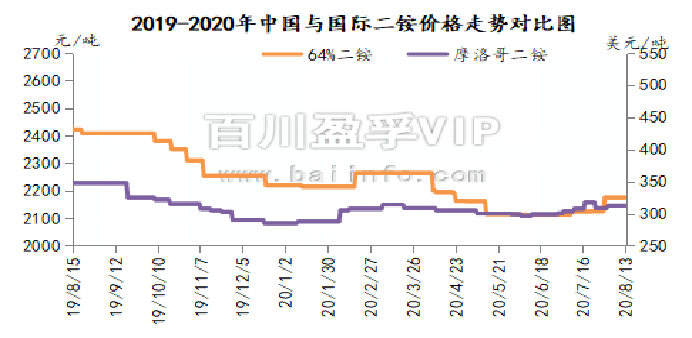 本周(2020.8.7-2020.8.13)国内磷酸二铵市场产销两旺,工厂货紧,限量接单:二铵工厂表示8月份产量已全部订出,部分工厂暂停接单;部分工厂9月下旬货源基本售出;部分工厂表示出口订单停收。西南货源64%二铵主流出厂成交2150元/吨以上;湖北货源64%二铵主流成交2200-2250元/吨。山东货源64%二铵主流成交2400-2450元/吨。内销市场开始铺货,河北、山东、河南、陕西及新疆等地为主,以执行买断价为主。