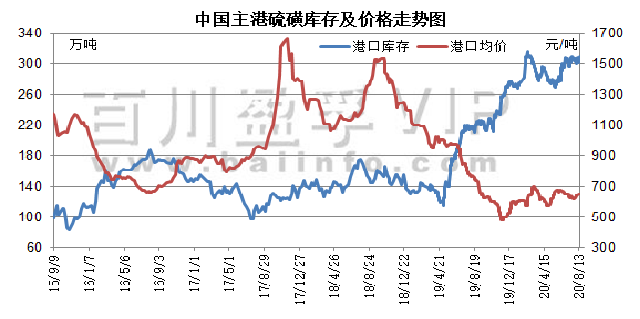 本周(2020.8.7-2020.8.13)国产硫磺价格延续涨势,多数地区炼厂报价上调,其中山东地区因资源紧缺尚未缓解,价格涨势仍较强劲。目前日韩主要炼厂开工仍未完全恢复,整体开工率约在6-7成左右,后期硫磺供应仍以长协为主,现货市场上一船难求,导致近期国内港口液硫库存一直处于5000吨以下低位水平。国内供应方面,山东炼厂近期采用低硫原油为主,总体日产量亦有小幅降低,以青岛大炼油为例,青岛炼化硫磺装置产能24万吨,硫磺装置运行正常时,硫磺正常日产量600吨左右,但目前日产液硫约400-450吨。而浙江石化近期液硫产出比例有所提升,8月液硫供应总量2万吨左右(此前液硫月产量约1.5万吨),但本月的出厂量,大多为弥补之前的长约,短期难以缓解现货供应紧张的局面。同时,华北、山东及华东地区硫酸行业稳好运行,下游需求方面亦提供有力支撑,因此本周液硫价格继续推涨。不过,据悉本月中下旬国内潍坊港、龙口港仍有液硫船抵港计划,下游工厂按需回运,资源紧缺或有一定缓解,加之部分下游企业转采固硫维持生产,亦减少一定供应压力,因此短线预计国产硫磺价格仍可能延续涨势,但涨幅有限。