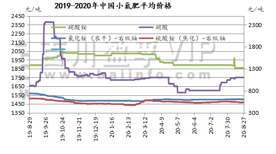 本周(2020.8.21-2020.8.27)国内磷酸二铵市场产销两旺,本周二湖北货源正式官宣调涨价格:64%二铵出厂价整体调涨至2250-2280元/吨,高端报价出厂2350元/吨,实际新单出厂成交价2200-2250元/吨;西南货源64%二铵主流出厂报价2200-2250元/吨以上,实际新单成交2180-2200元/吨左右。华北地区64%二铵主流第一到站价2500元/吨。由于今年二铵同比价格偏低,受国内外需求拉动,实际成交价格逐步回归正常水平。