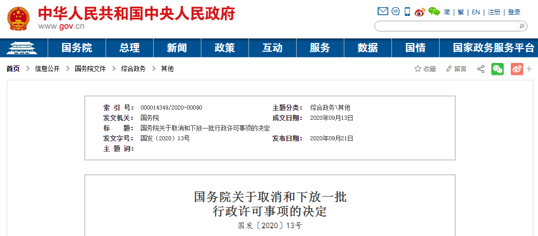 以下为《关于取消和下放一批行政许可事项的决定》(国发〔2020〕13号)全文: