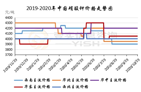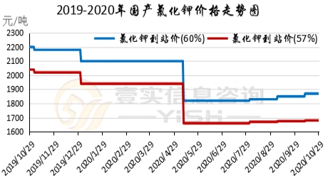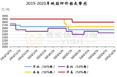 10月硫酸钾市场原料成本增加,副产盐酸价格走低,厂家价格稳中有小幅上调趋势。云南烟用硫酸钾中标结果公示,除了第五标段以外,罗钾为第一中标候选人,报价2550元/吨;水溶性硫酸钾第一中标候选人为标优美生态工程股份有限公司,报价2780元/吨。烟草招标对市场供应有一定消化,同时罗钾公司2020年销售目标已提前超额完成,10月22日起年内不再接新单。市场供应量有所减少。曼海姆硫酸钾50%粉主流出厂价2400-2600元/吨左右,52%粉出厂价2500-2700元/吨左右,优惠幅度在50-100元/吨。东北地区50%粉主流出厂报价2550元/吨;华南地区价格相对较高,50%粉主流出厂报价2900元/吨。青海水盐体系硫酸钾主流到站报价2300-2350元/吨左右,成交有限,实际成交可谈。国投罗钾公司硫酸钾装置开车,基本已恢复正常生产,10月22日起,罗钾公司硫酸钾产品售价上调100元/吨。年内不接新单。