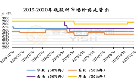 11月硫酸钾市场挺价盘整运行,价格小幅上行,市场供应量有所减少,原料成本有一定支撑,开工暂无明显波动,下游需求缓慢推进。罗钾2020年度销售任务已完成,售价持续两次上调。硫酸钾10月出口量4.3万吨,1-10月硫酸钾出口33.39万吨,同比上涨13.81%。曼海姆硫酸钾50%粉主流出厂价2500-2600元/吨左右,52%粉出厂价2600-2700元/吨左右,优惠幅度在50-100元/吨。东北地区50%粉主流出厂报价2500元/吨;华南地区价格相对较高,50%粉主流出厂报价2950元/吨。青海水盐体系硫酸钾主流到站报价2350-2400元/吨左右,成交有限,实际成交可谈。国投罗钾公司硫酸钾装置正常生产,罗钾52%粉末硫酸钾现汇价格2750元/吨,市场前期货源有限。