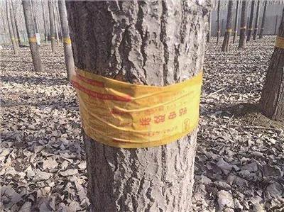 有些害虫越冬期需要通过主干爬到地下越冬,如无患子铃斑翅夜蛾。防治时抓住越冬前在它下树前在树干上,涂上一层粘虫胶或绑一圈黏虫胶带,害虫就无法下树越冬。