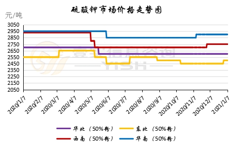 本周硫酸钾市场挺价探涨,东北市场需求有所提升,交投回暖,市场可售现货偏紧。曼海姆硫酸钾50%粉主流出厂价2550-2650元/吨左右,52%粉出厂价2650-2750元/吨左右,优惠幅度在50-100元/吨。东北地区硫酸钾供应量较为紧俏,价格上行,50%粉主流出厂报价2600元/吨;华南地区价格相对较高,50%粉主流出厂报价2950元/吨。青海水盐体系硫酸钾供应较为紧俏,价格维持高位,主流到站报价2500元/吨左右,实际成交可谈。国投罗钾公司硫酸钾装置正常生产,罗钾52%粉末硫酸钾现汇价格2750元/吨左右。