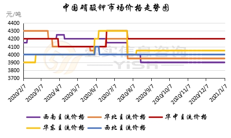 价格方面:12月中上旬价格平稳,场内交易氛围一般,下游工厂多按需拿货,库存相对充足; 下旬价格小幅下降。月末国内工业级一等品硝酸钾报价4137.50元/吨,较月初下跌0.3%, 环比上涨了0.3%,同比去年下跌了4.9%。农业用硝酸钾市场基本保持稳定运行,月底主流厂家报价3750-4500元/吨,基本与11月底报价相同。