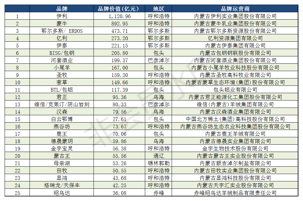 内蒙古25大品牌:伊利第一,呼和浩特9个。