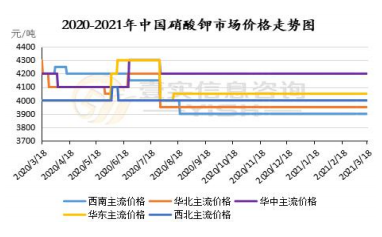 价格方面:西北地区硝酸钾农业级参考报价为 4000 元/吨,熔岩级含税出厂报价 4500 元/吨,工业级 99.6%出厂报价 4800 元/吨,市场价格稳定,企业报价维持淡稳。华东地区硝酸钾价格暂无变化,农业级主流参考价为 4050 元/吨,工业级粉状硝酸钾含税出厂报价 4150 元/吨,华东地区农业级产量较多,主供山东及周边蔬菜等经济作物使用。