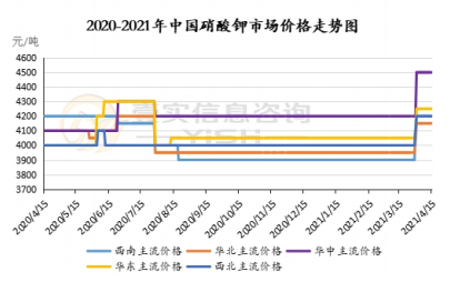 本周(2021.4.9-2021.4.15)硝酸钾市场平稳运行,价格高位盘整,局部地区小幅上调。上游原料氯化钾主流价格暂稳,商家持观望态度,实交商谈为主。硝酸钾受原料波动影响,成本压力较大,价格始终维持高位,市场整体供应紧张,下游贸易商按需拿货,短期内市场受高价影响成单意愿有所减弱,接单情况一般。