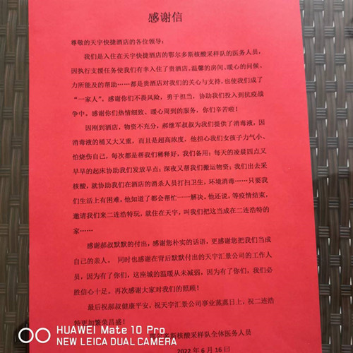 拿到感谢信的酒店值班人员郝继军说:“这些孩子们年龄都和自己的孩子差不多,看到她们为了二连浩特疫情防控工作那么辛苦,只是做了一点力所能及的事情,更应该感谢的是这些孩子们为二连浩特疫情防控做出的努力”。
