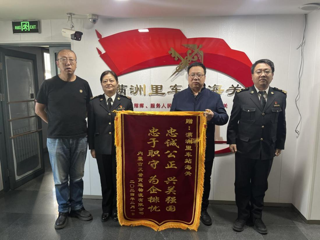 2024年2月4日,我天宇汇景集团内蒙古天誉货运物流有限公司执行董事钱满带通关业务经理李锰到满洲里车站海关,并赠送题为“忠诚公正、兴关强国、忠于职守、为企排忧”的锦旗,对车站海关过去一年对我公司给予的支持和帮助表示感谢,车站海关陈广志副关长、郭东升科长亲切接见。